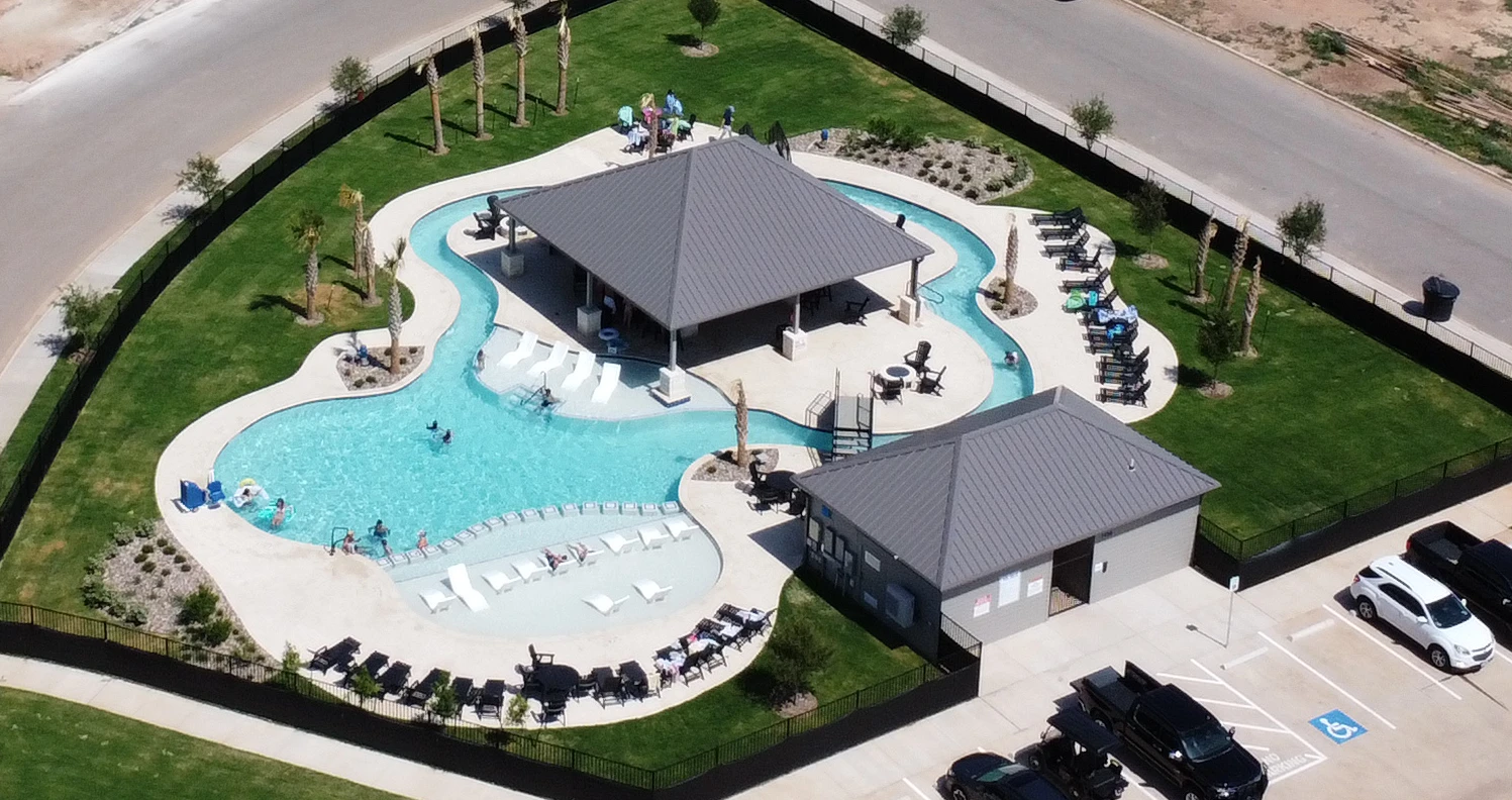 Our state-of-the art outdoor living space boasts a sprawling pool with a luxurious infinity-edge pool, a relaxing covered cabana perfect for lounging, several in-pool tanning ledges, multiple outdoor grills for delicious cookouts with friends and neighbors, a spacious event lawn for gatherings, and a lengthy lazy river, complete with a custom waterfall bridge, for kids big and small.